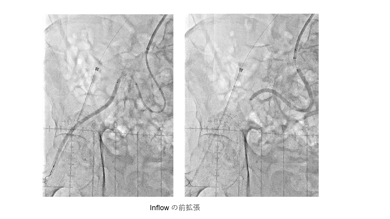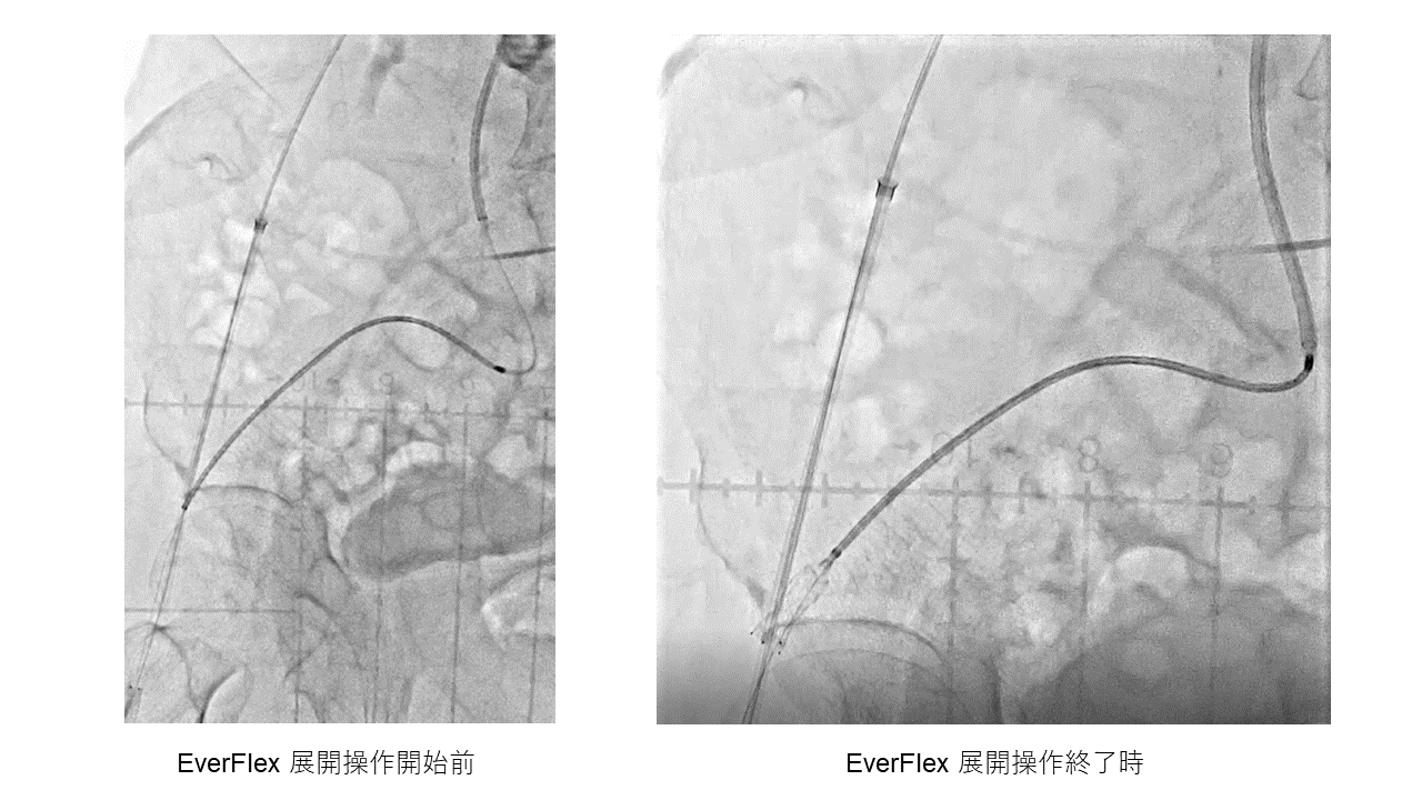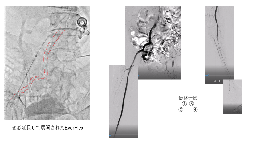 右趾間潰瘍で紹介の80歳代男性。CT/USにてヘアピン2個と大きな湾曲からなる右EIAの起始部からPopAまでの、比較的柔らかい血栓性閉塞と診断しEVTを施行。左上腕動脈の6Fr Guiding sheathからSFA近位までwiring、右CFA順行穿刺でFPのwiring、4mm径12cm長バルンで前拡張、FPにステント3本留置し6mm径バルンで後拡張しつつ左上腕からの0.014GWをtrappingし、左上腕からEverFlex 8*120mm (150cm shaft)を持ち込み。屈曲蛇行し20cm長はある腸骨動脈の遠位までstent到達したため展開したが、僅かに展開されたのみでthumb wheelが回りきってしまった。Stent delivery systemは相当な力で抜去し得たがEverFlexはグングン延長し大動脈まで到達して展開された。0.014GWはdelivery system内で固着しており抜けてしまった。ヘアピン部で顕著にstent狭小化しており、0.035GWをstent脇に通し直してEXPRESS stent留置方針とした。35GW通過するも5Frカテ不通過で14GW変更→IVUSで通過路確認は不能。CFA逆行穿刺追加し35→14GWを大動脈まで通すも変形stentに阻まれバルン/IVUSが通過しきれず断念。35GW (stiff) を順行性に通過させ、pull-throughとして逆行性にdeviceを持ち込んでの拡張に切り替え。Conquest 6*40mmはヘアピン部で行き詰るがBADFORM techniqueにて引き込み順次拡張、同様にBADFORMでEXPRESS stent 4本を持ち込んで順次留置し再建に成功。2本ないし2重stentingとなったことで末梢塞栓や血栓逸脱なくbailoutし得た。