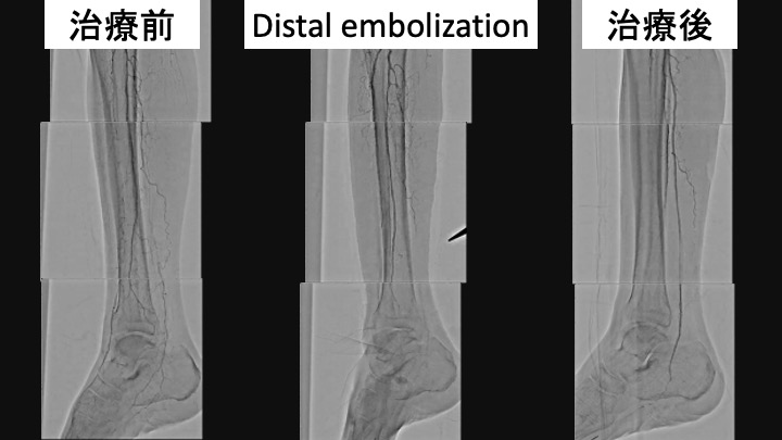 症例は70代男性、糖尿病性腎症で維持透析中である。右足趾の虚血性潰瘍を認めた。SFAにびまん性高度狭窄、ATA、PTAに高度石灰化を伴うCTOを認め、EVTの方針となった。午後6時に手技を開始した。ATAは石灰化に阻まれアンテからのワイヤー通過は不能、足背動脈を穿刺し、プルスルーを確立しバルーン拡張を行った。しかし、アンテのワイヤーが足背動脈遠位に通過せず、穿刺部での血管損傷のためATAから足背動脈への血流が途絶えてしまった。PTAは閉塞しているが、側副血行路経由で足底動脈の血流は確認できたため、SFAの治療を行い手技終了の予定とした。しかし、SFAをDCBで拡張したところ、遠位塞栓により足首以下の血流が消失した。繰り返し血管拡張薬を投与するも血流の改善認めなかった。そのため、PTAへのEVTを追加する方針とした。この時点で午後11時半であった。アンテからのワイヤーは通過せず、石灰化を目印にPTA遠位を穿刺し、ワイヤー通過に成功した。バルーン拡張後はPTAから足底動脈への血流が得られ、午前3時に手技を終了した。