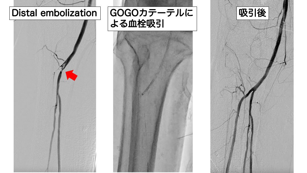 症例:右間歇性跛行を認める60代男性。浅大腿動脈(SFA)のステント内閉塞に対してEVTを施行した。6Frガイディングシースを挿入しクロスオーバーアプローチで手技を開始した。ワイヤー通過後、Hirano domeでdistal protectionを施行し6Frガイディングカテーテルでステント内を繰り返し血栓吸引した。その後、病変全体を5mmのロングバルーンで拡張した。SFA入口付近のステント内に多量の血栓像を認めたため血栓吸引と6mmショートバルーンによる拡張を行なった。造影を行なってみると血栓が膝下動脈近位3分岐まで飛散し血流の低下を認めた。Hirano domeを確認するとアクシデンタルにカフが減圧されていた。前脛骨動脈(ATA)、脛骨腓骨動脈幹へワイヤーを通過させkissing balloon techniqueを施行したが有効ではなかった。そこでバルーンカテーテルを用いてGOGOカテーテルをATA入口部に選択的に誘導し血栓吸引を行なった。これにより血栓塊を除去することに成功し血流の再開を認めた。